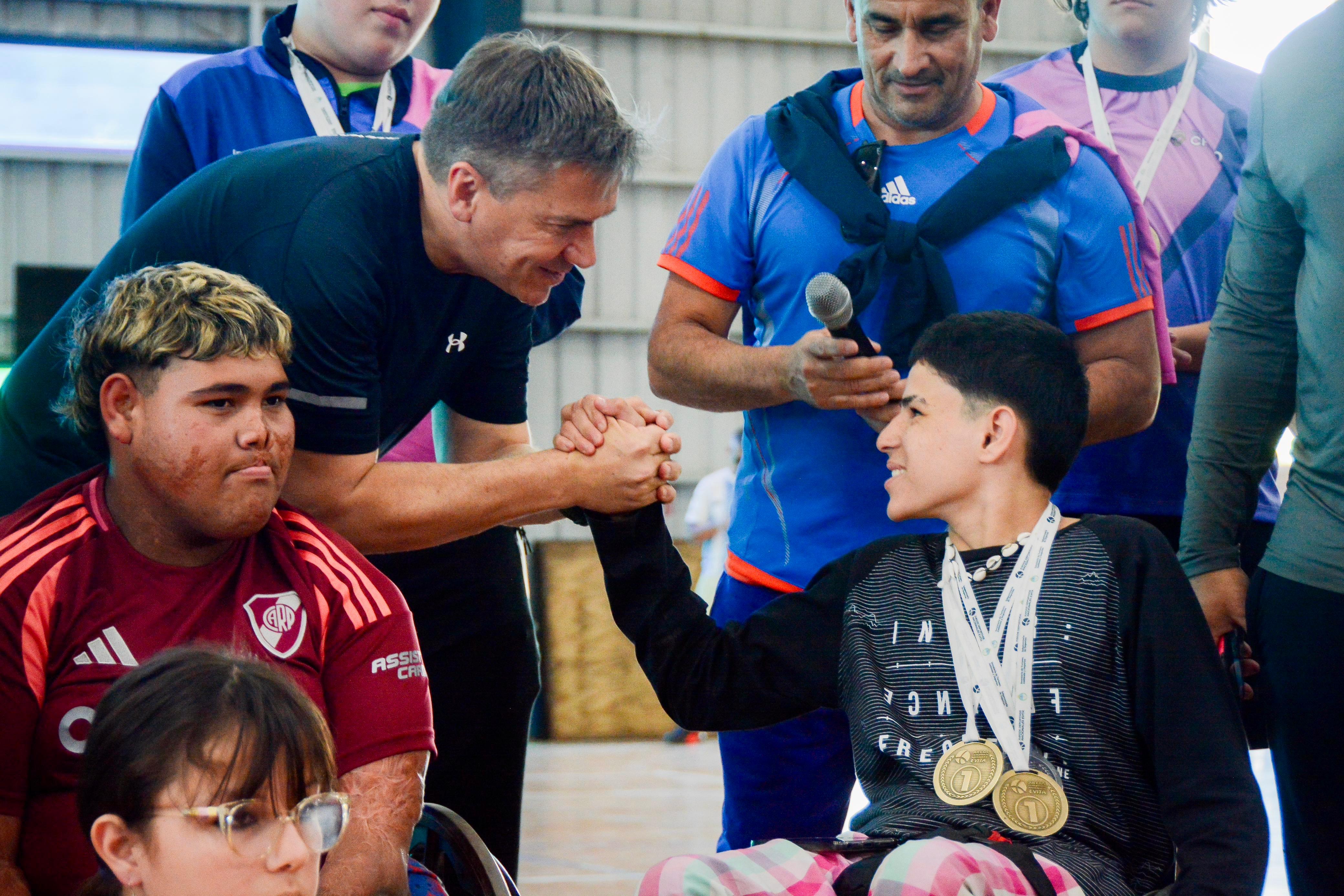 ”Muchísima emoción, hace días salieron con las valijas cargadas de ilusiones acompañados de sus profes y de sus familias; felicitaciones por dejar bien en alto al Chaco, por el compromiso, por las medallas, porque a partir de mañana seguiremos trabajando para la próxima edición de Chaco Juega, por nuevas oportunidades, por la verdadera inclusión, la solidaridad y el compañerismo. Agradezco al Instituto del Deporte, a los profes, a los padres, porque vamos a acompañarlos permanentemente y decirles también que a todos los que fueron coronados van a contar, desde el Instituto, con una beca por un año para seguir apoyando la solidaridad, los buenos valores y a la vida sana- expresó el gobernador junto a Ana Mitoire, de IPRODICH, la vicepresidente Mónica Morales y al presidente de Lotería Chaqueña Lucas Apud Masin.