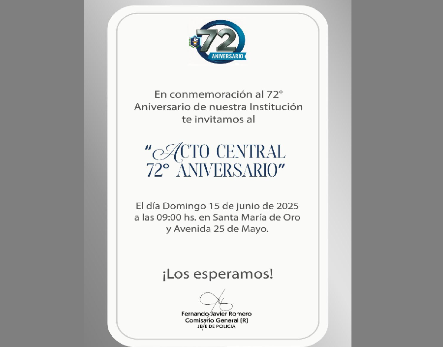 La Policía de la Provincia del Chaco tiene el honor de invitar a la comunidad en general a participar del acto conmemorativo por el 72º Aniversario de su creación, que se llevará a cabo el día domingo 15 de junio de 2025, a partir de las 09:00 horas, en la intersección de avenida Mitre y avenida 25 de Mayo, en la ciudad de Resistencia.