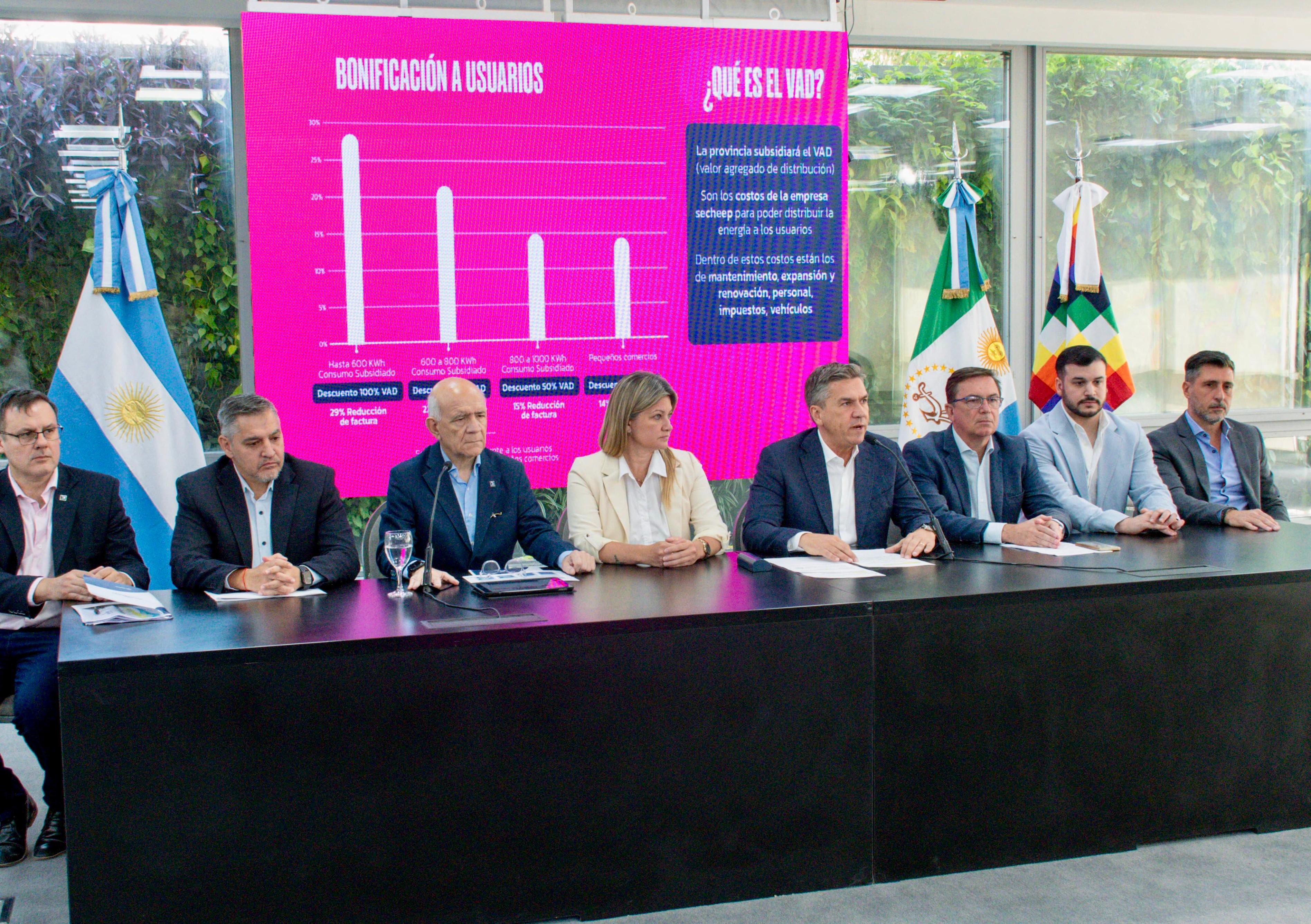 Acompañaron al titular del ejecutivo chaqueño, durante este anuncio en el Salón Obligado, la secretaria general de Gobierno, Carolina Meiriño; el secretario coordinador de Gabinete, Livio Gutiérrez; el ministro de Hacienda y Finanzas, Alejandro Abraam; el subsecretario económico Guillermo Agüero; el presidente de Secheep, José Bistoletti; el vocal de la empresa Germán Perelli y el diputado provincial Ivan Gÿoker.