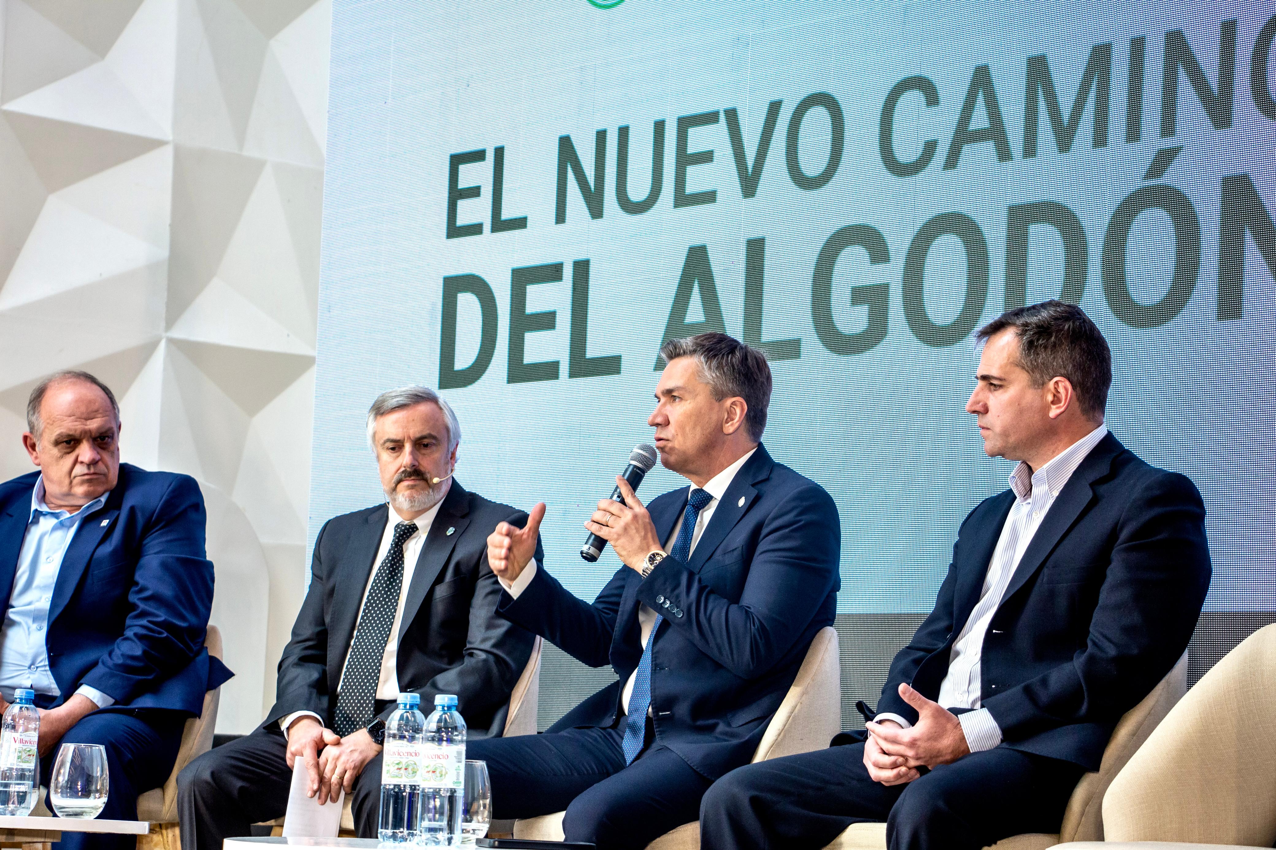 El gobernador Leandro Zdero, junto al ministro de Producción y el Desarrollo Económico Sostenible, Oscar Dudik, acompañaron este jueves en la Bolsa de Cereales de Buenos Aires el lanzamiento de “El nuevo camino del algodón”, en el marco de la presentación del primer algodón con tres eventos Biotecnológicos, que tiene proyección comercial y permitirá bajar la utilización de agroquímicos, como así también brindar más protección frente a insectos y malezas.