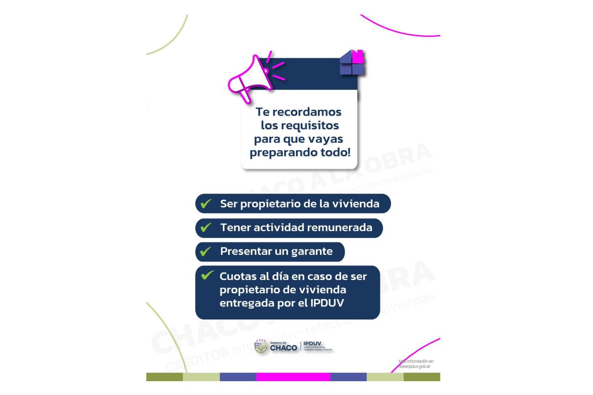 La línea contará con tres modalidades: una de cuatro millones, otra de siete millones y una tercera de diez millones. La inscripción para acceder a estos créditos comenzará el 4 de noviembre y se extenderá hasta el 25 de este mes. Es importante señalar que el proceso se realizará exclusivamente en ipduv.chaco.gob.ar, sin atención presencial, mientras que toda la información de la operatoria será cargada en dicho sitio como también en las redes sociales del organismo.