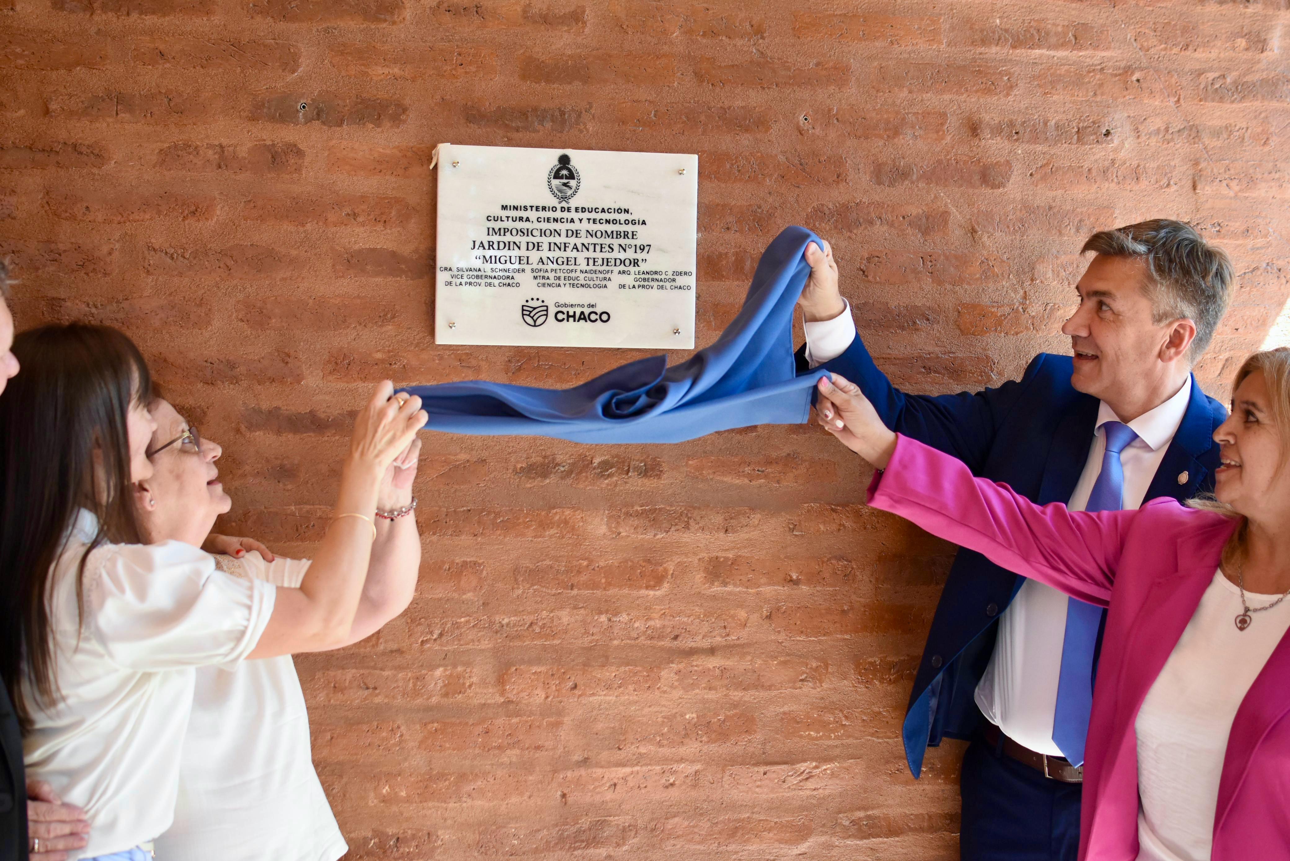 El jefe del Ejecutivo, junto a la vicegobernadora Silvana Schneider y a la ministra de Educación, Sofía Naidenoff, en el marco de su visita a Charata por la inauguración del ciclo lectivo de Nivel Primario y del edificio de la Escuela Primaria Nº 1027, también acompañó el acto de imposición del nombre de “Miguel Ángel Tejedor” al Jardín de Infantes Nº 197 del barrio Costanera Sur de esta localidad.