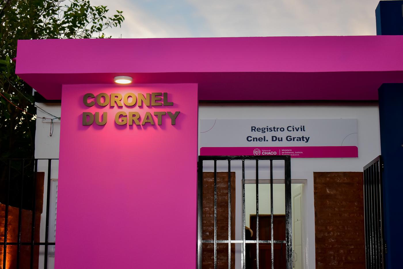Se realizaron tareas de reemplazo de aberturas de madera por aberturas de aluminio, tanto en ventanas como en puertas, además de la iluminación adecuada del predio. A su vez, se realizaron trabajos de pintura integral del edificio, interior y exterior con las reparaciones previas en revoques. Se realizó el portal institucional de identificación del organismo, y las estructuras de seguridad. Se ejecutó el cerramiento perimetral para disminuir la exposición a actos de vandalismo y otros riesgos. El Registro Civil de la Localidad de Coronel Du Graty, es un inmueble de 11 metros de frente y 20 metros de fondo. Las instalaciones cuentan con Área administrativa, Sala de Casamientos, Centro de Documentación Rápida, Cocina y Baño.