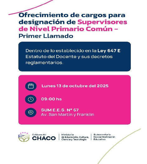 El Ministerio de Educación del Chaco informa que hoy, lunes 13 de octubre, se realizarán los actos de ofrecimiento de cargos de supervisores para los niveles Inicial y Primario (común) en este último caso -primer llamado- a partir de las 9 Hs, en el Salón de Usos Múltiples de la Escuela de Educación Secundaria (EES) N° 67, ubicada en avenida San Martín y calle Franklin, de Resistencia.