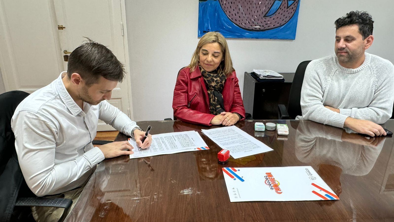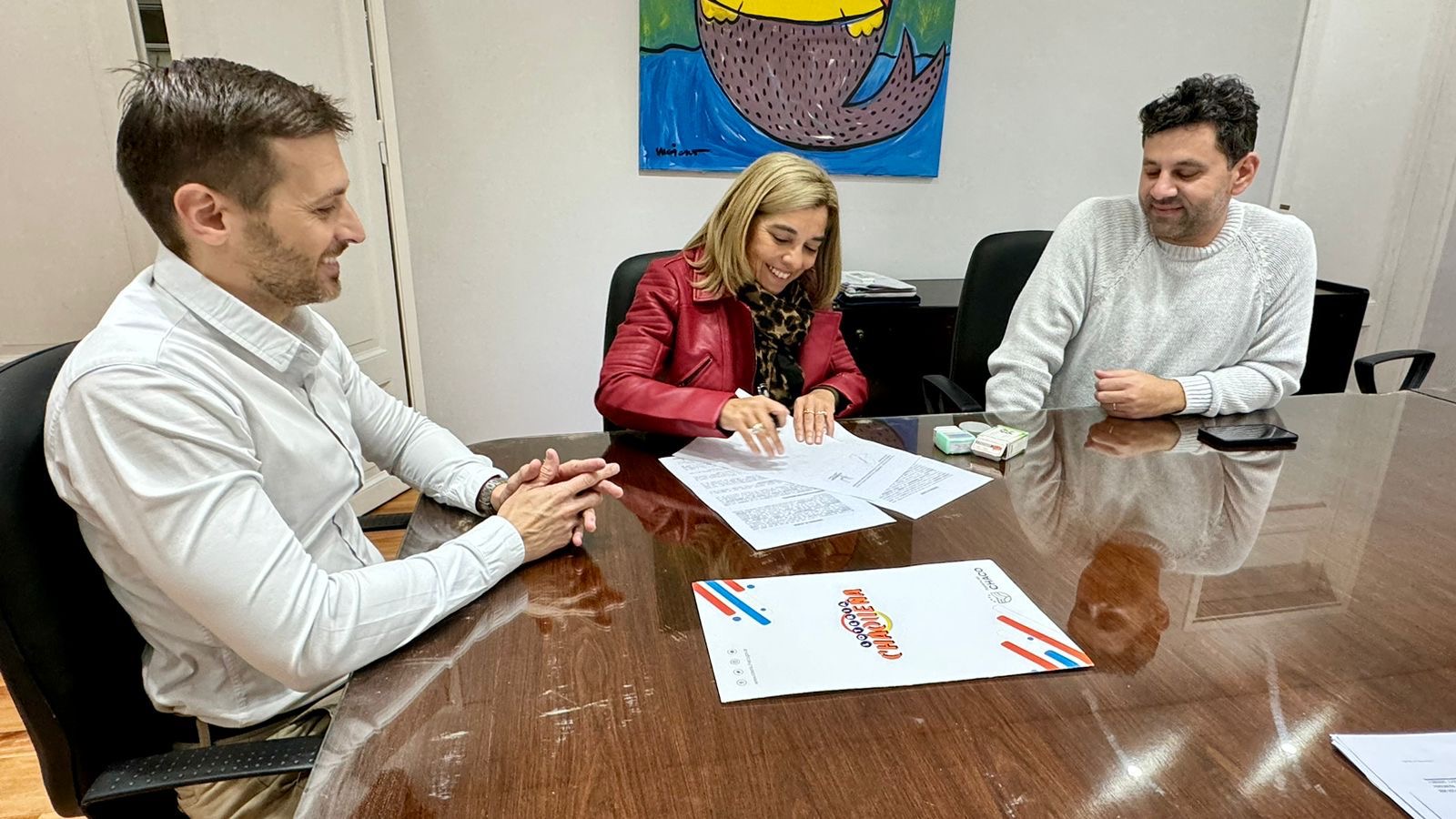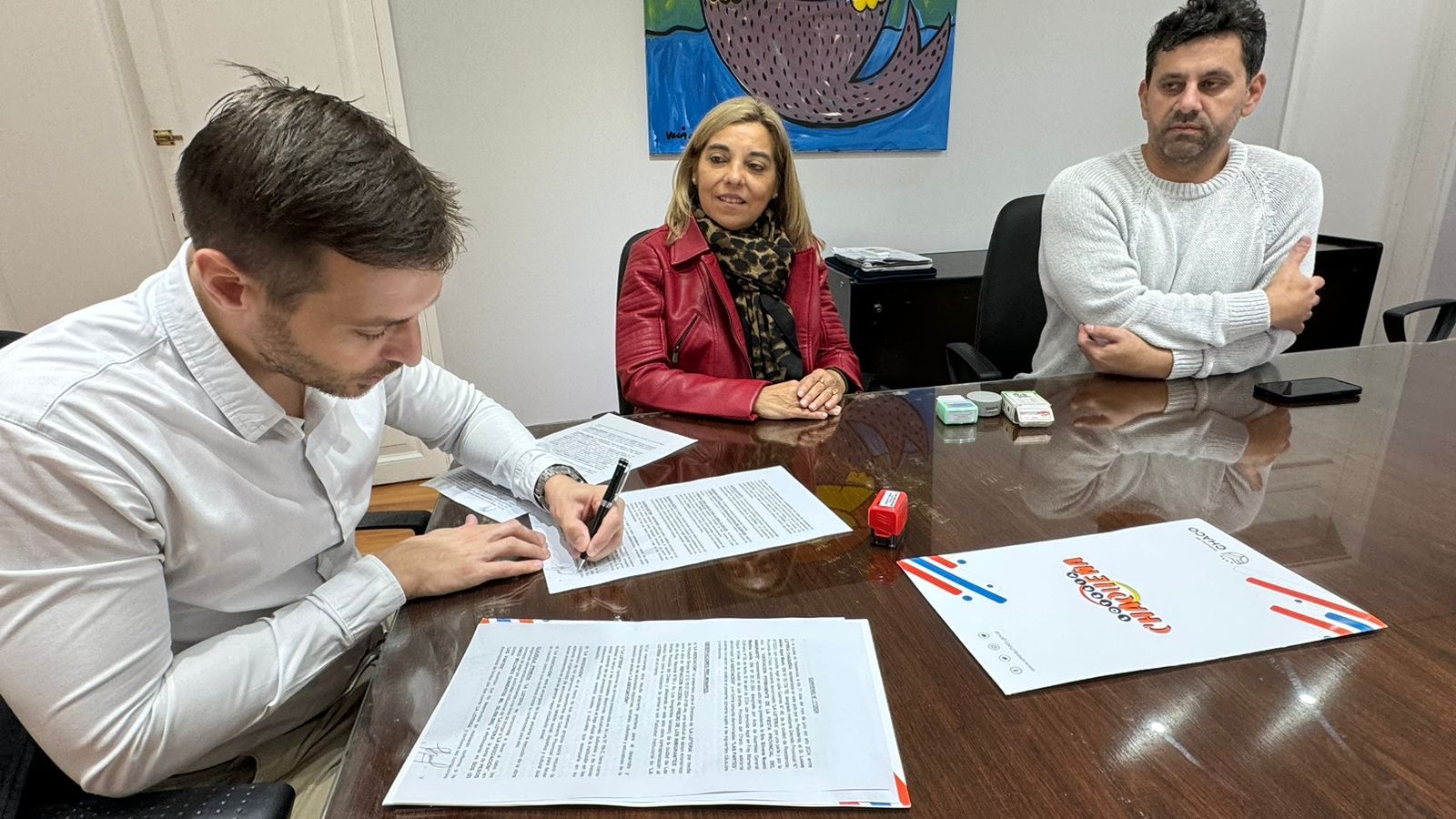El presidente de Lotería Chaqueña, Lucas Apud Masín y el vocal oficial Juan Chaussivert trazaron un acuerdo junto a la titular de la Asociación Permanente “Fiesta Provincial del Inmigrante” Silvana Medina Laola, para realizar el portal de ingreso, en el predio que se realiza el tradicional evento.