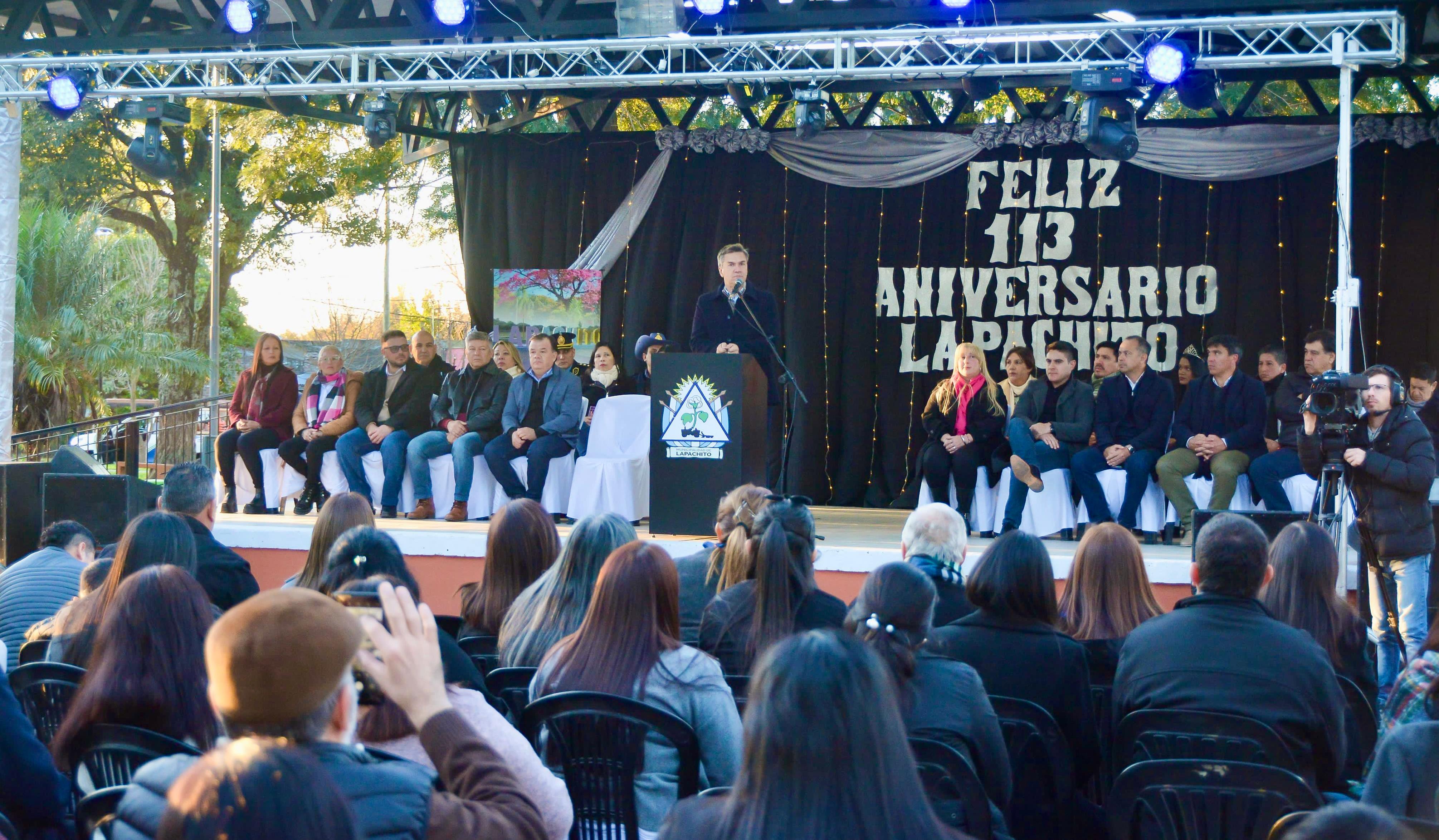 Con la presencia del intendente local, Roberto Domínguez; y el secretario de Legal y Técnica, Julio Ferro e intendentes de la zona, Zdero celebró los 113 años de Lapachito, “porque detrás de este pueblo hay historia, hay dificultades, pero también hay logros, hay muchos logros, así que eso también se festeja”.