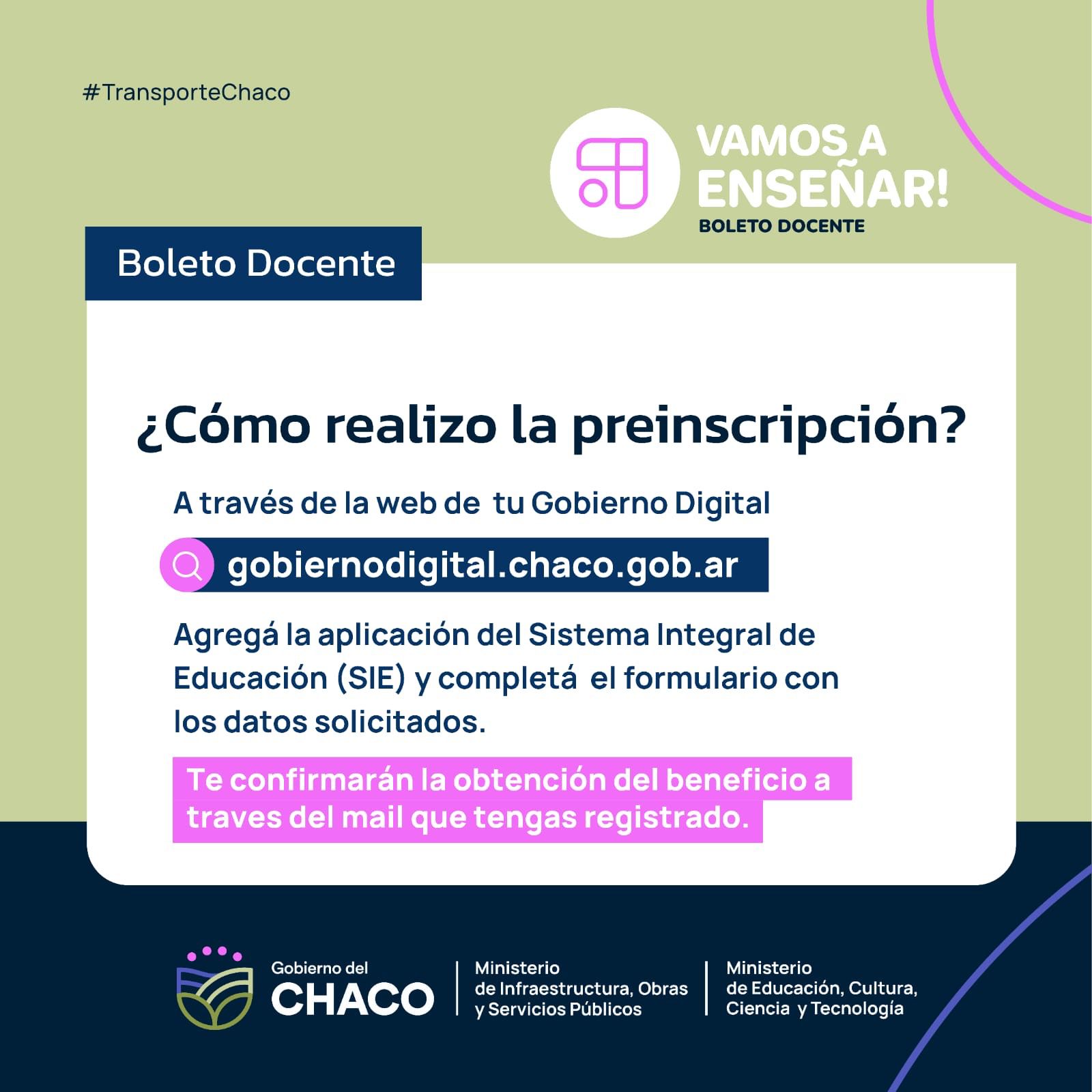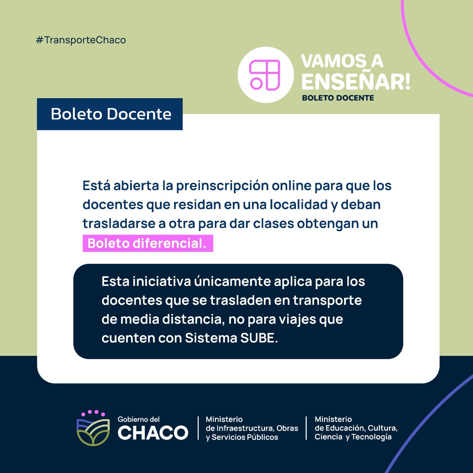 El gobierno de la Provincia del Chaco, a través del Ministerio de de Infraestructura, Obras y Servicios Públicos y la Subsecretaría de Transporte y Logística del Ministerio y en conjunto con el Ministerio de Educación, Cultura, Ciencia y Tecnología, anunciaron el lanzamiento del Programa “Vamos a Enseñar” del Boleto Docente.