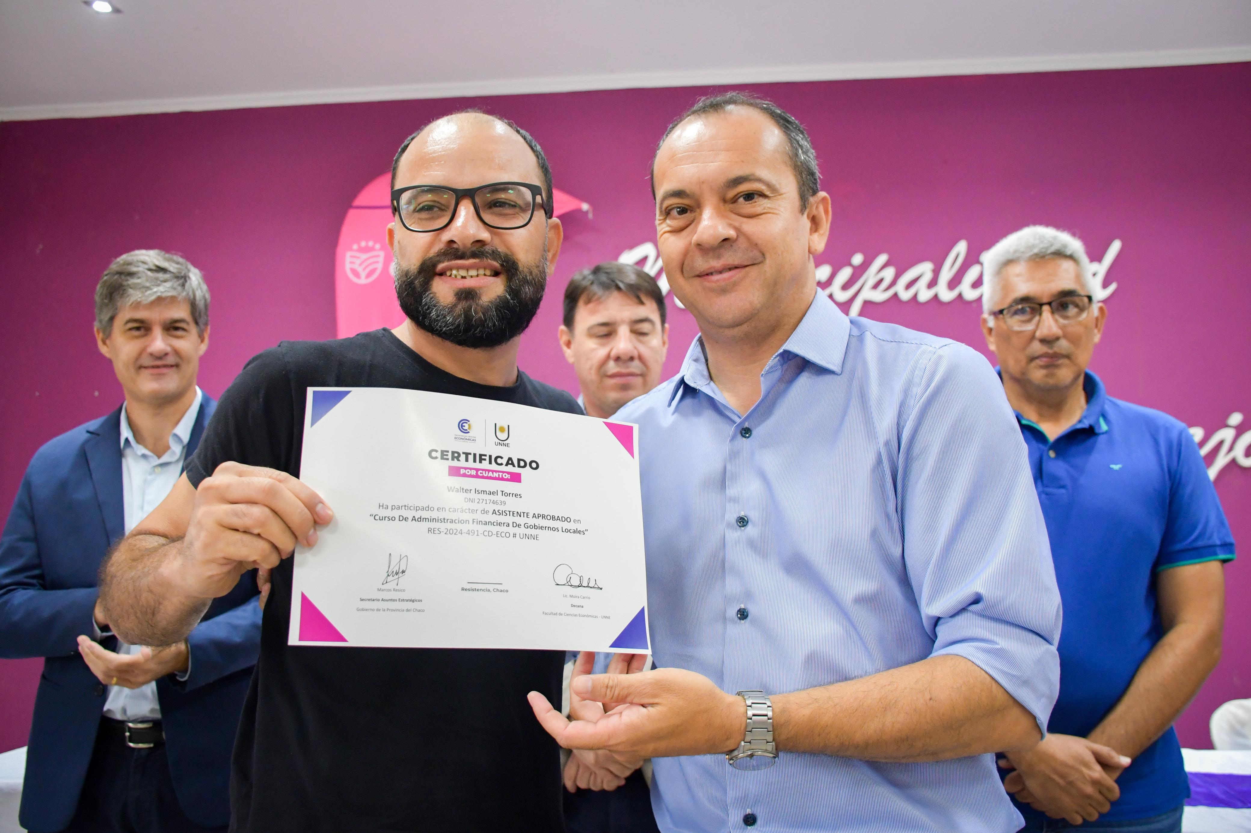 Este viernes, por la mañana, el Secretario de Asuntos Estratégicos, Marcos Resico junto al al Lic. Patricio González, Secretario Gral. de Extensión Universitaria UNNE; al Magister Celestino Fantin, Vicedecano de la Facultad de Ciencias Económicas; al subsecretario de municipio, Marcelo Barrios y al Lic. Federico Martos, Sec. de Extensión y Ejercicio Profesional de la Facultad de Ciencias Económicas, entregaron en Concepción del Bermejo, los certificados correspondientes a la Capacitación de Gestión y Administración de los Gobiernos locales destinado a personal de los municipios. La bienvenida, estuvo a cargo del intendente local, Raúl Maldonado acompañado por otros intendentes de la región y la secretaria de gobierno de Los Frentones. “Para nosotros siempre es un privilegio estar cerca de la UNNE, somos hijos de esta Casa de Estudios, hemos pasado muchos años y también formamos parte de ese equipo de trabajo. La Universidad tiene mucho para darle a nuestra provincia, a nuestros pueblos, junto a sus autoridades por eso acercamos esta capacitación dirigida al personal municipal para ir mejorando los recursos humanos y llegar a muchos objetivos trazados. Hoy estamos muy contentos por esta articulación y porque hay más de 260 graduados en esta región, y así, damos por finalizado este ciclo”- manifestó el secretario de Asuntos Estratégicos, Marcos Resico, junto al subsecretario de municipio, Marcelo Barrios.