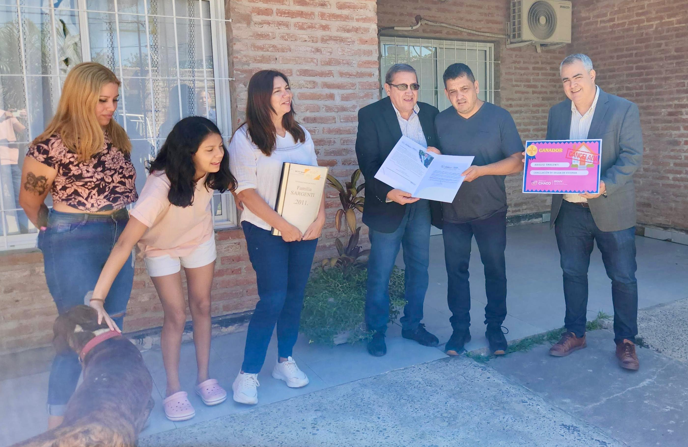 Adolfo Sargenti, junto a su familia, recibió por parte de los vocales Daniel Monti y Diego Gutiérrez los documentos otorgados por el Instituto Provincial de Desarrollo Urbano y Vivienda (IPDUV).