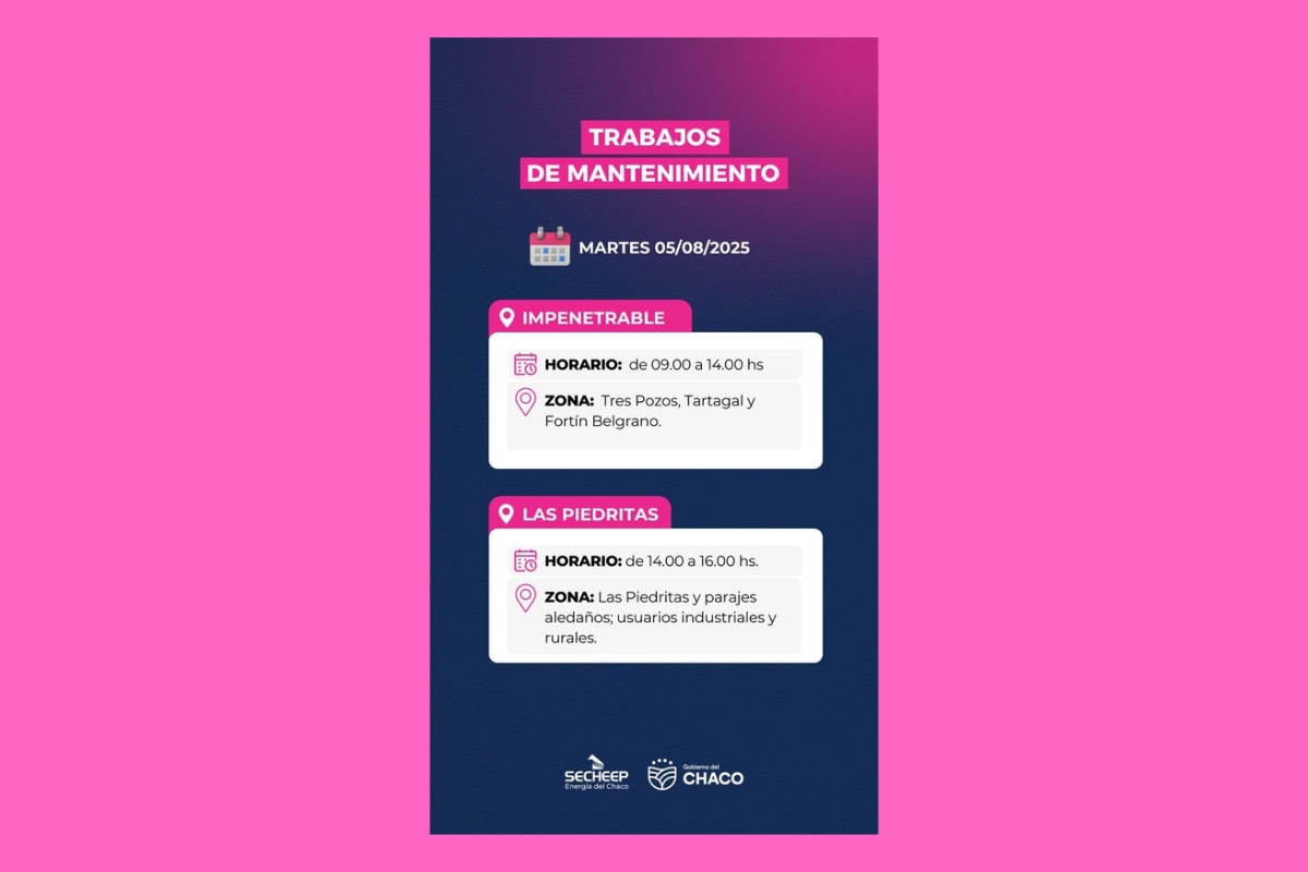 La empresa Secheep informó que este martes 5 de agosto realizará trabajos programados de mantenimiento en distintos puntos de la provincia.