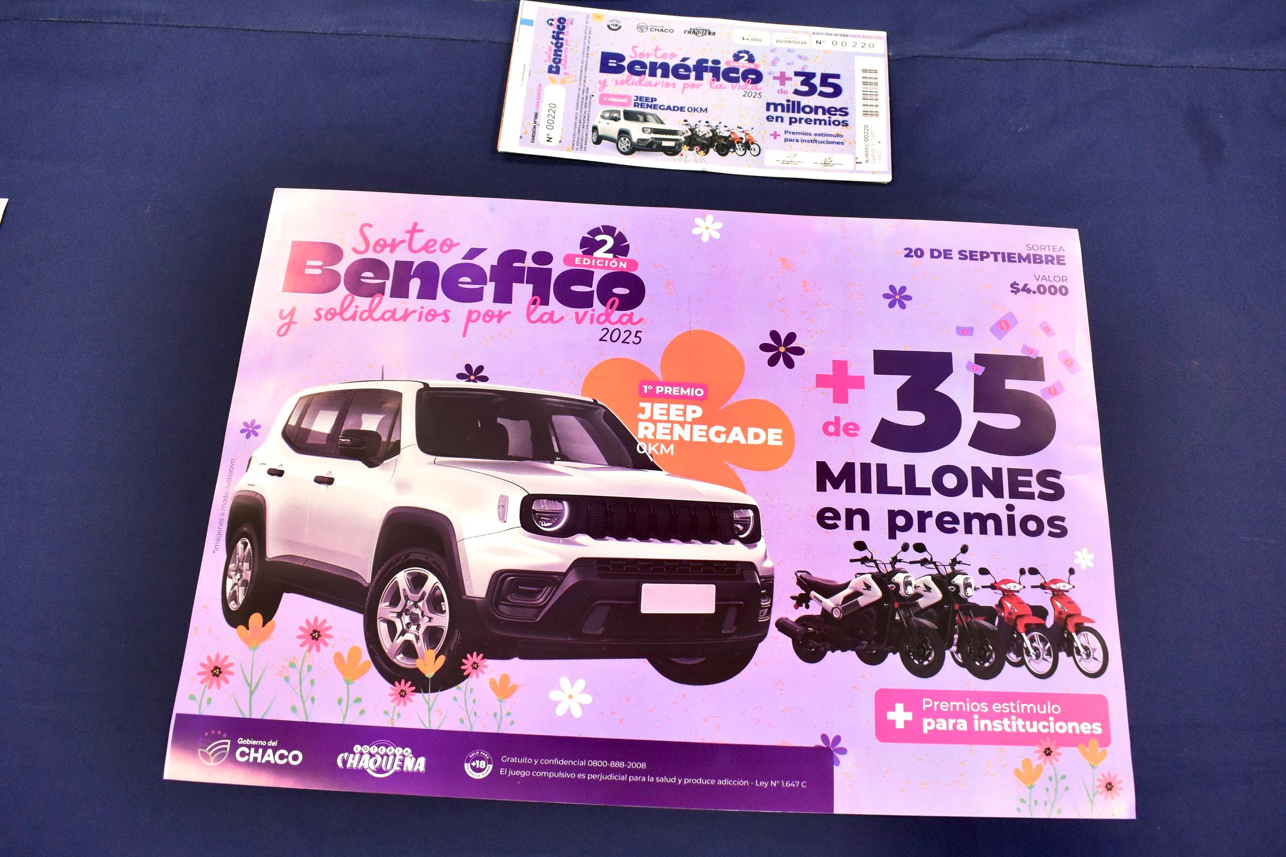 Se sortea el 20 de septiembre, con un Jeep Renegade 0km y 35 millones de pesos como premio. El bono tendrá un valor de $4000, la retribución será del 70% para las entidades sin fines de lucro y del 90% para las personas con problemas de salud.