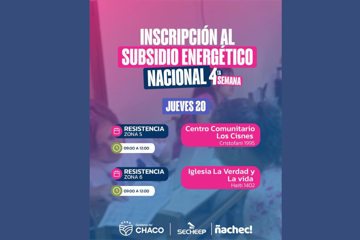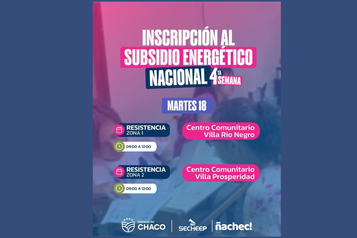 Desde el martes 18 y hasta el viernes 21 de febrero, de 9 a 12, en diferentes zonas de Resistencia y Barranqueras, se llevará a cabo la cuarta semana de los operativos de inscripción al subsidio energético nacional y de asesoramiento sobre el "Descuento Verano". El abordaje es realizado por el Gobierno provincial a través de SECHEEP y el Programa Ñachec, con el objetivo de mitigar los aumentos de la Nación a las facturas de luz de los chaqueños.