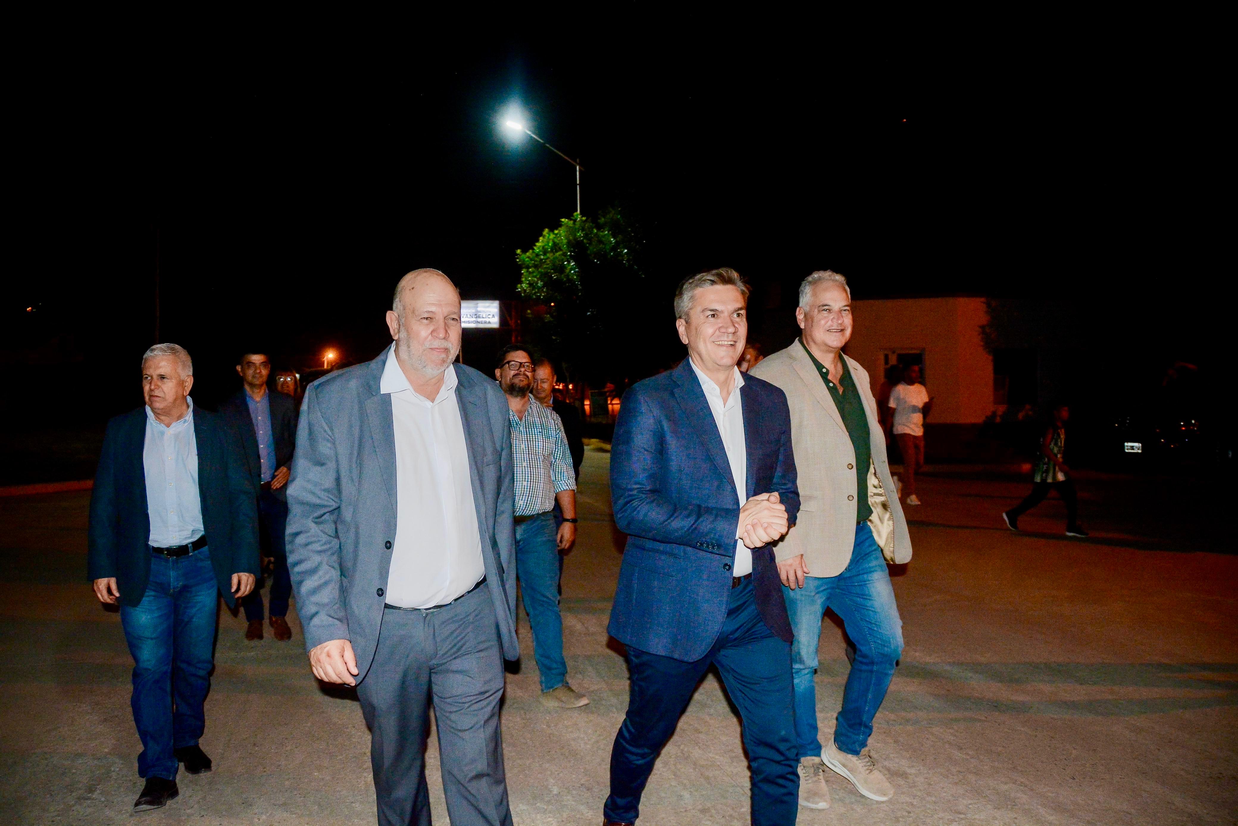Junto al intendente Dalmasso y al ministro de Infraestructura, Hugo Domínguez, el primer mandatario provincial habilitó la nueva plazoleta y cuadras de pavimento para la localidad.