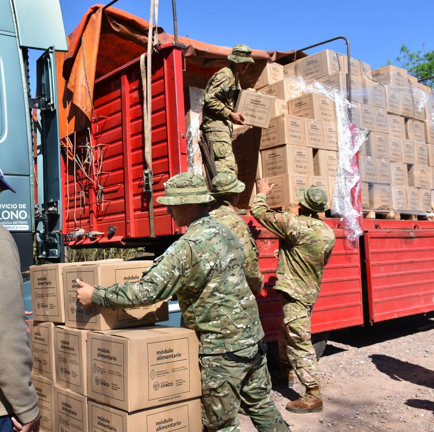 Mediante un trabajo articulado con el Ministerio de Capital Humano, a cargo de Sandra Pettovello y el Ministerio de Defensa a cargo de Luis Petri, continuamos asistiendo a más Parajes con la entrega de más de 22.000 módulos de alimentos y más de 38.400 botellas de agua potable en El Impenetrable chaqueño.