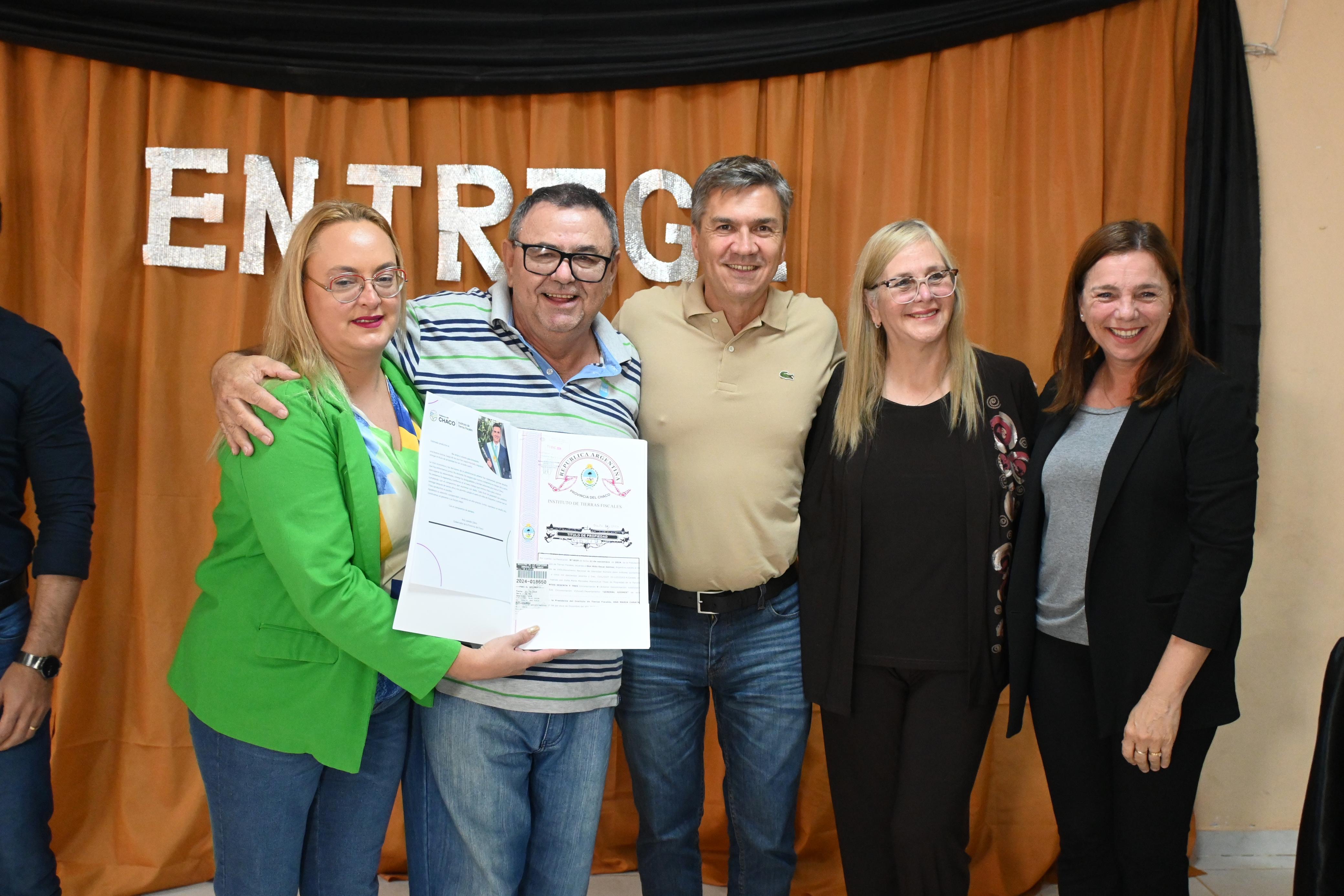 El gobernador Leandro Zdero, encabezó el acto de entrega de los títulos de propiedad y las adjudicaciones de tierras fiscales. Además, a través de la Fundación Somos Chaco, cuya titular es María Martina, se entregaron elementos de jardinería y para merenderos. “Esto significa recuperar lo que es de la gente, lo que fue el cobijo y la trayectoria de su familia y de esta manera entendemos que estamos recuperando la dignidad del Pueblo del Chaco”, dijo el primer mandatario provincial.
