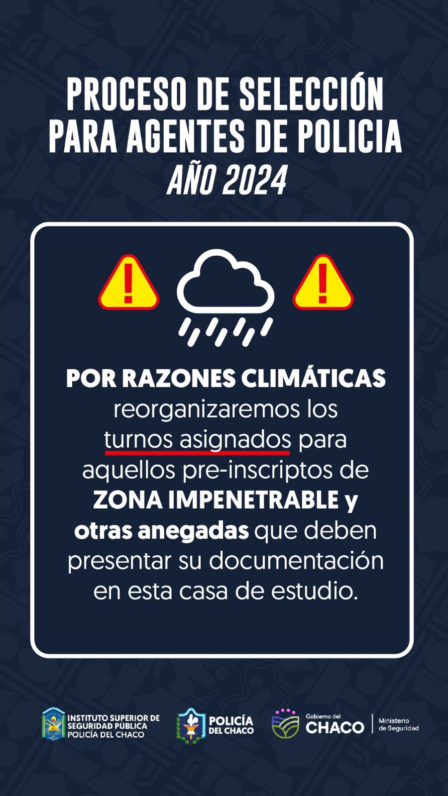 Se reprogramará la recepción de documentación para aquellos que deben hacer la entrega de la misma en esta casa de estudio y no pueden presentarse por razones climáticas.