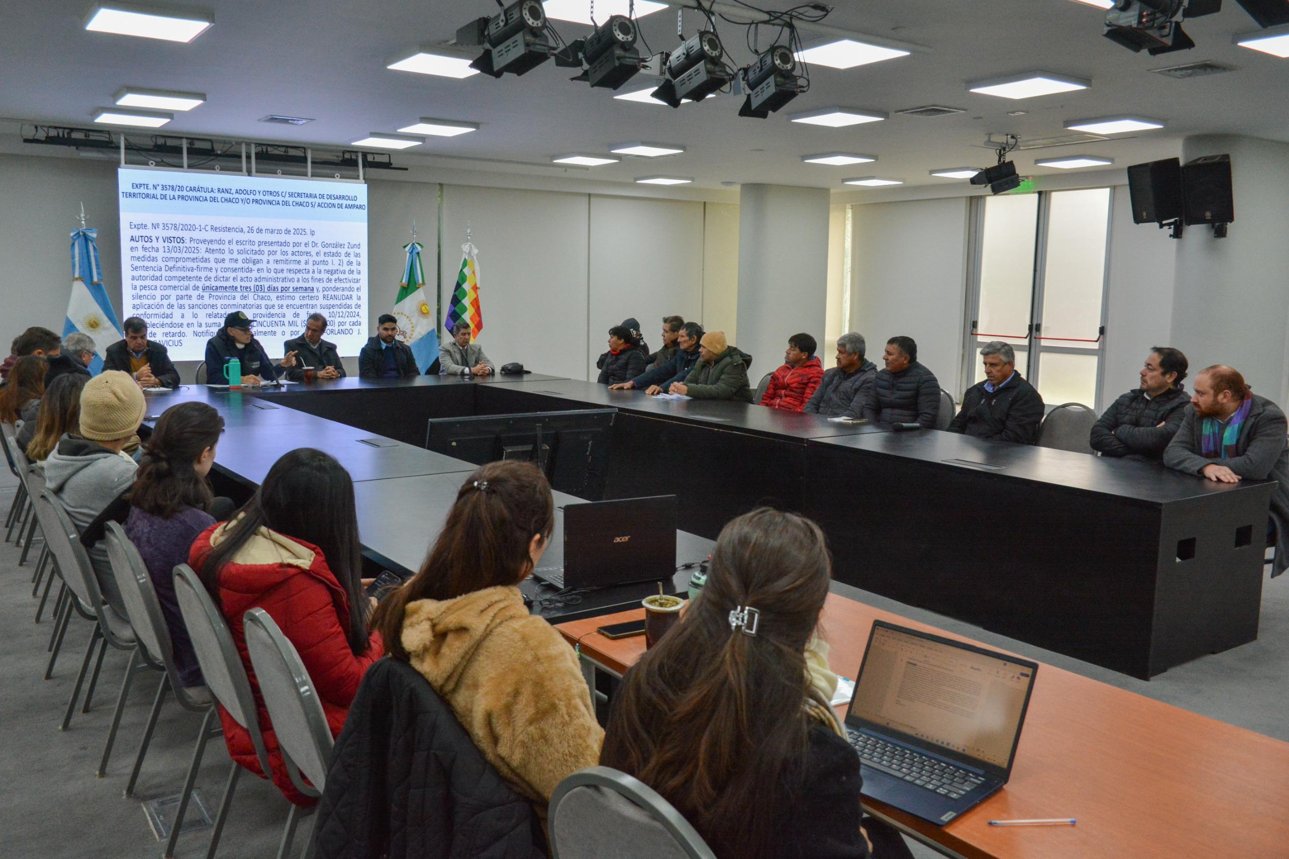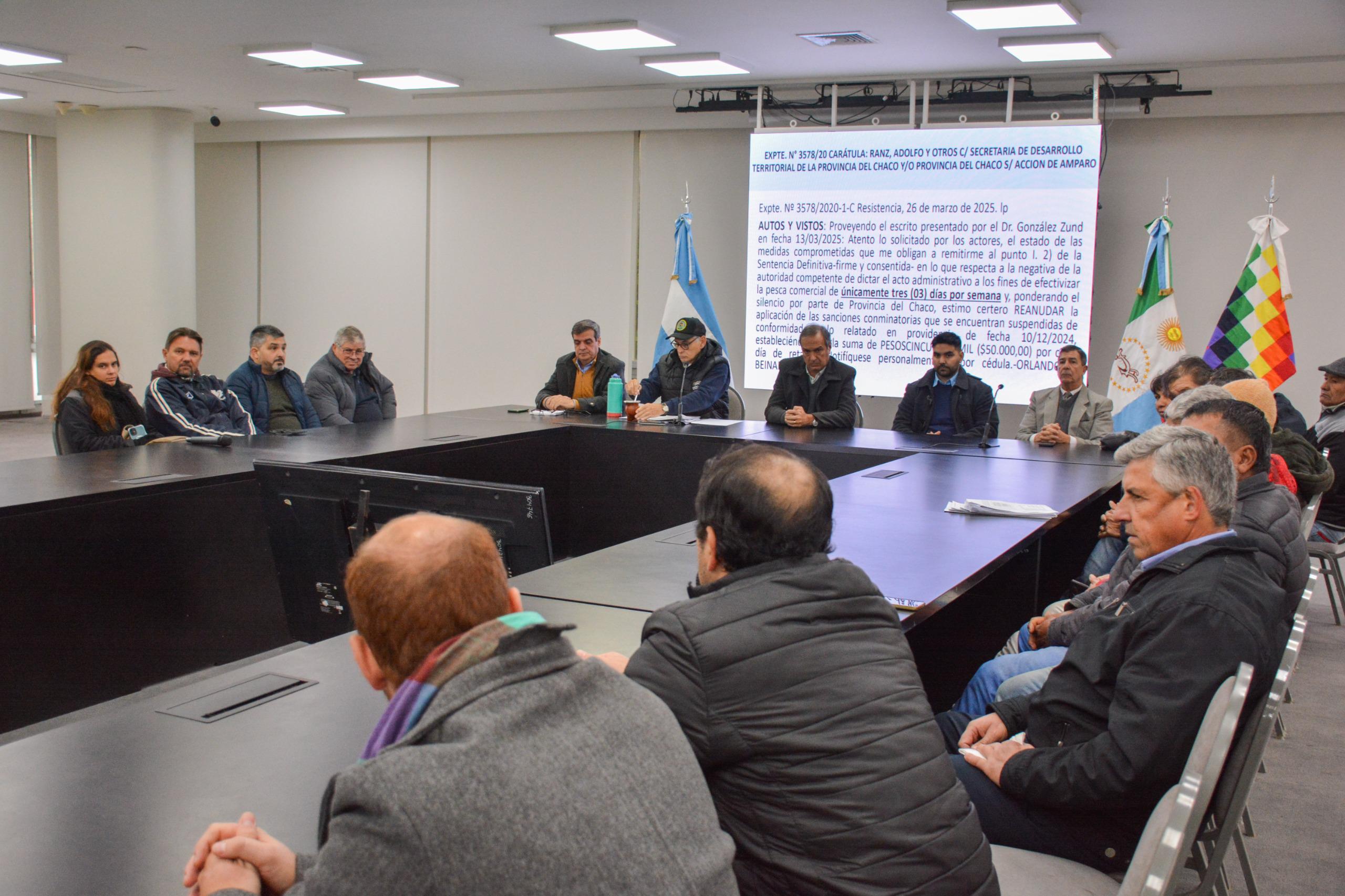 El Ministerio de la Producción y el Desarrollo Económico Sostenible, presidió una reunión en el Salón Obligado de Casa de Gobierno, destinada a pescadores comerciales matriculados y a las asociaciones que los representan. El encuentro tuvo como objetivo informar sobre la normativa vigente que regula la pesca comercial en el territorio provincial, en cumplimiento de lo dispuesto por el Juzgado Civil y Comercial N.º 21 de Resistencia, en el marco de la causa “Ranza Adolfo y otros”.