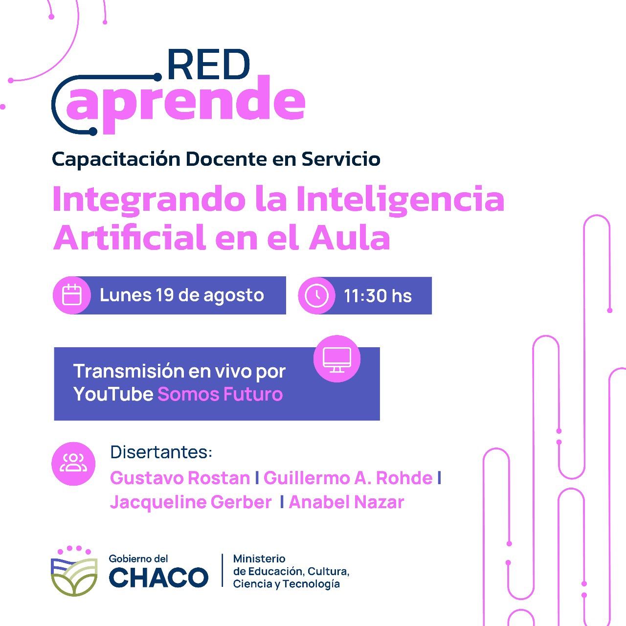 Finalmente, el miércoles 14 de agosto se puso en marcha el trayecto Inteligencia Artificial y la Neuro-Tecno-Pedagogía. Las llaves de la innovación en la Educación del Futuro, con la disertación de una eminencia como es el doctor Gustavo de Elorza Feldborg, argentino con formación académica en universidades nacionales e internacionales. Cerca de 20.500 docentes se inscribieron para aprender sobre la Inteligencia Artificial, la neurociencia y la tecnología para aplicar en las aulas. El disertante propone "dar a conocer a los docentes cómo opera un cerebro que está aprendiendo; cómo lo hace a través de la tecnología, y las mejores prácticas que pueden desarrollar para utilizar la tecnología y diseñar sus actividades de acuerdo a ese cerebro que está aprendiendo".