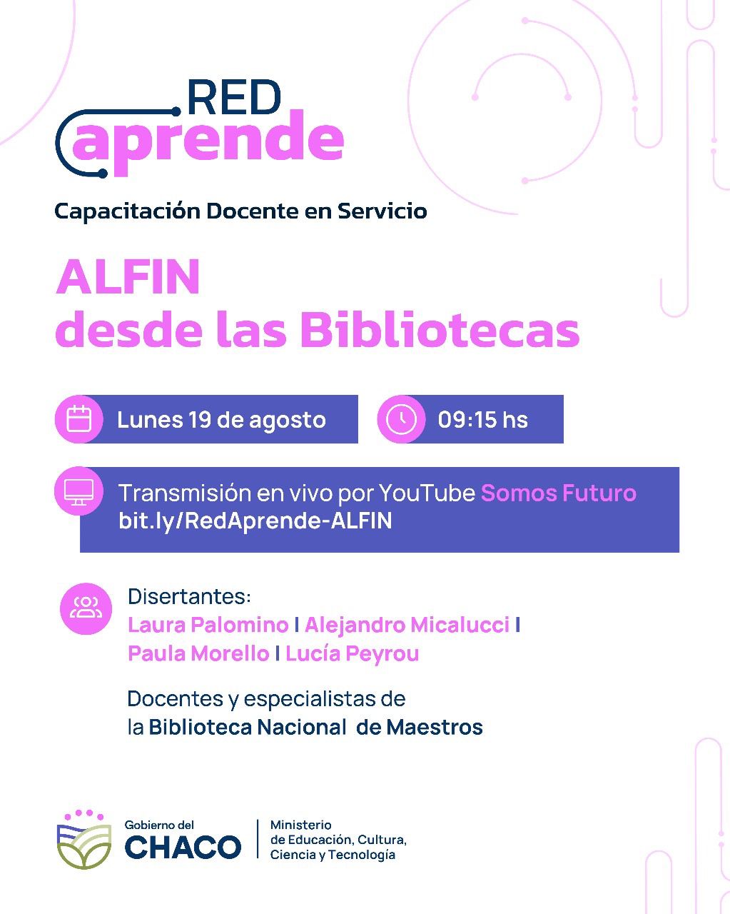 El lunes 12 de agosto dio inicio la segunda propuesta de Red Aprende, donde alrededor de 17 mil docentes, directivos y supervisores del segundo y tercer ciclo de nivel Primario y todas las modalidades, del ciclo básico, auxiliares, directivos y supervisores de nivel Secundario asumieron el desafío de capacitarse en Alfabetización avanzada y académica. María Julia Simoni y Mabel Lobo, responsables del trayecto, señalaron que la propuesta "apunta a aquellos estudiantes que han sido alfabetizados, que saben leer, pero que deben profundizar la lectura para aprender", y se enmarca en el Plan Nacional de Alfabetización y el Plan Somos Alfabetización Chaco, "siguiendo la perspectiva del compromiso del Gobierno de la Provincia de continuar con acciones de perfeccionamiento docente en el área de alfabetización”.