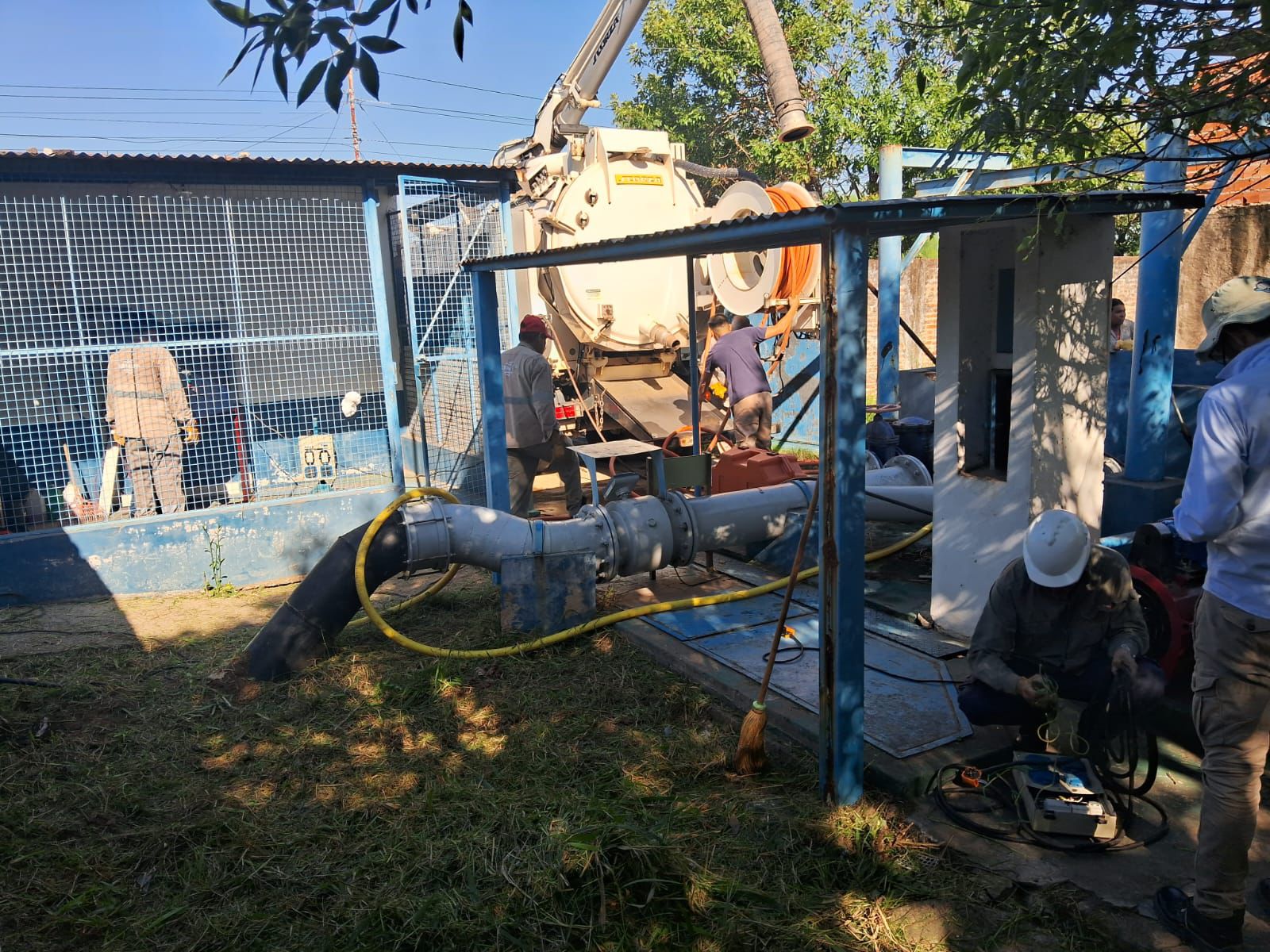 Entre las acciones realizadas, se destacan el taponamiento con by pass, limpieza del pozo, amurado de un nuevo codo base, trabajos de metalurgia para soportes y anclajes, y la adecuación de la cañería de impulsión de 200 a 160 milímetros.