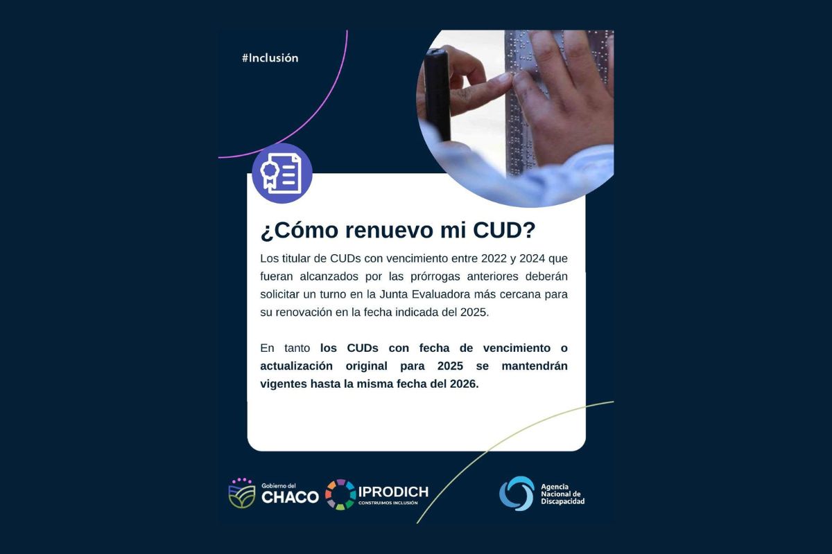 El Instituto Provincial para la Inclusión de las Personas con Discapacidad del Chaco (IPRODICH) comunica que la Agencia Nacional de Discapacidad (ANDIS), mediante la Resolución N° 2520/2024 publicada en el Boletín Oficial, ha dispuesto una prórroga de un año para los Certificados Únicos de Discapacidad (CUD) que tienen una fecha de actualización original en 2025. Esta medida no se aplica a los CUD con prórrogas vigentes de años anteriores (2022 a 2024), los cuales deberán renovarse durante el próximo año.