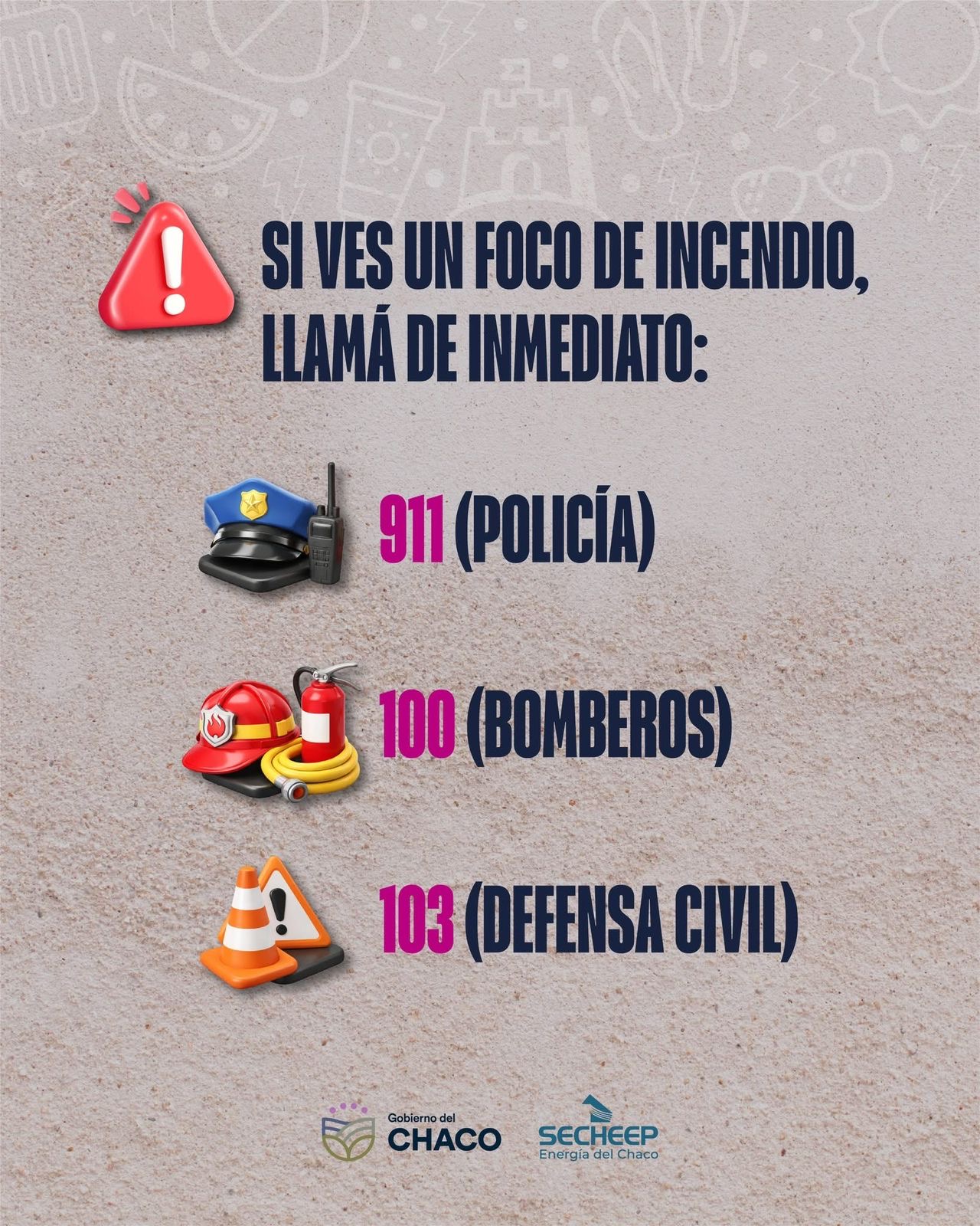 911 -Policía, 100 -Bomberos y 103 -Defensa Civil.
