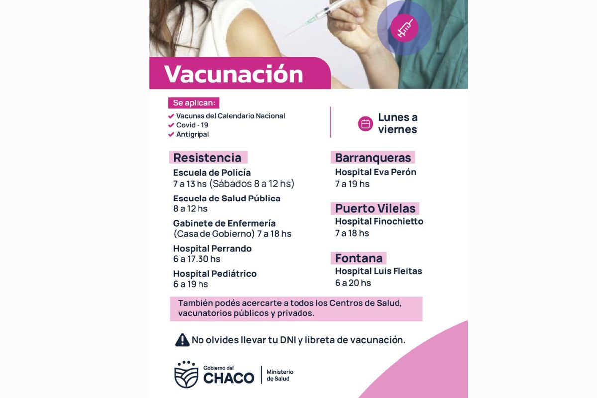 El Ministerio de Salud del Chaco informa los vacunatorios en los que se están aplicando las dosis en Resistencia, Barranqueras, Puerto Vilelas y Fontana.