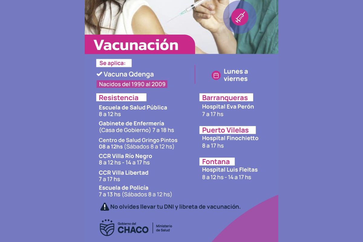 Se está llevando a cabo la vacunación con dosis del Calendario Nacional, Antigripal, contra el Covid-19 y la Fiebre Amarilla, como también la colocación de primera y segunda dosis de Qdenga (nacidos entre 1990 y 2009).