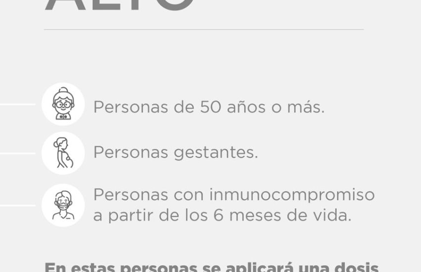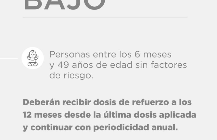 Si se trata de personas menores de 50 años con factores de riesgo, es decir, alguna enfermedad crónica u obesidad, personal de salud o personal estratégico que se considera a la fuerza de seguridad, deben recibir una dosis anual y continuar con esa periodicidad; si se trata de personas de seis meses a 49 años que no tengan ningún tipo de factores de riesgo, también es una dosis anual.