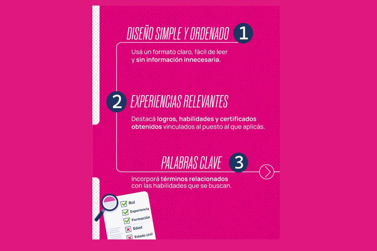 Un CV bien elaborado es clave para destacar el perfil profesional y aumentar las posibilidades de inserción en el mercado de trabajo. En este sentido, desde el programa se recomienda prestar especial atención a un diseño simple, claro y ordenado, que permita una lectura ágil de la información. Asimismo, es fundamental incluir experiencias laborales relevantes, priorizando aquellas vinculadas directamente con el puesto al que se aspira.