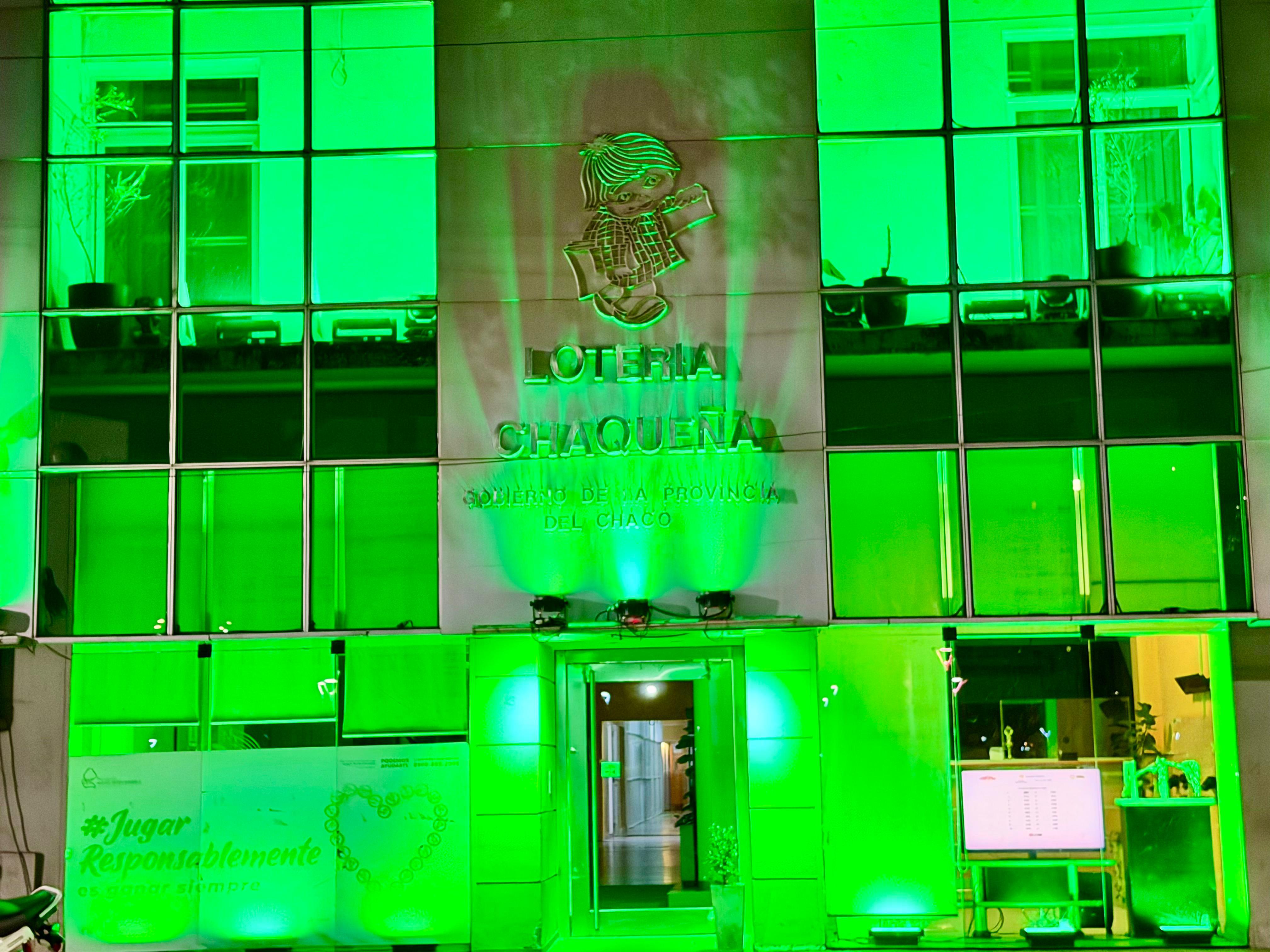 Como miembro de la Asociación de Loterías Estatales de Argentina (ALEA), el organismo provincial se sumó a la campaña nacional de concientización que consistió en iluminar de verde la fachada de sus edificios ubicados en Güemes 46, Avenida 9 de Julio 145 y Frondizi 75 de Resistencia.